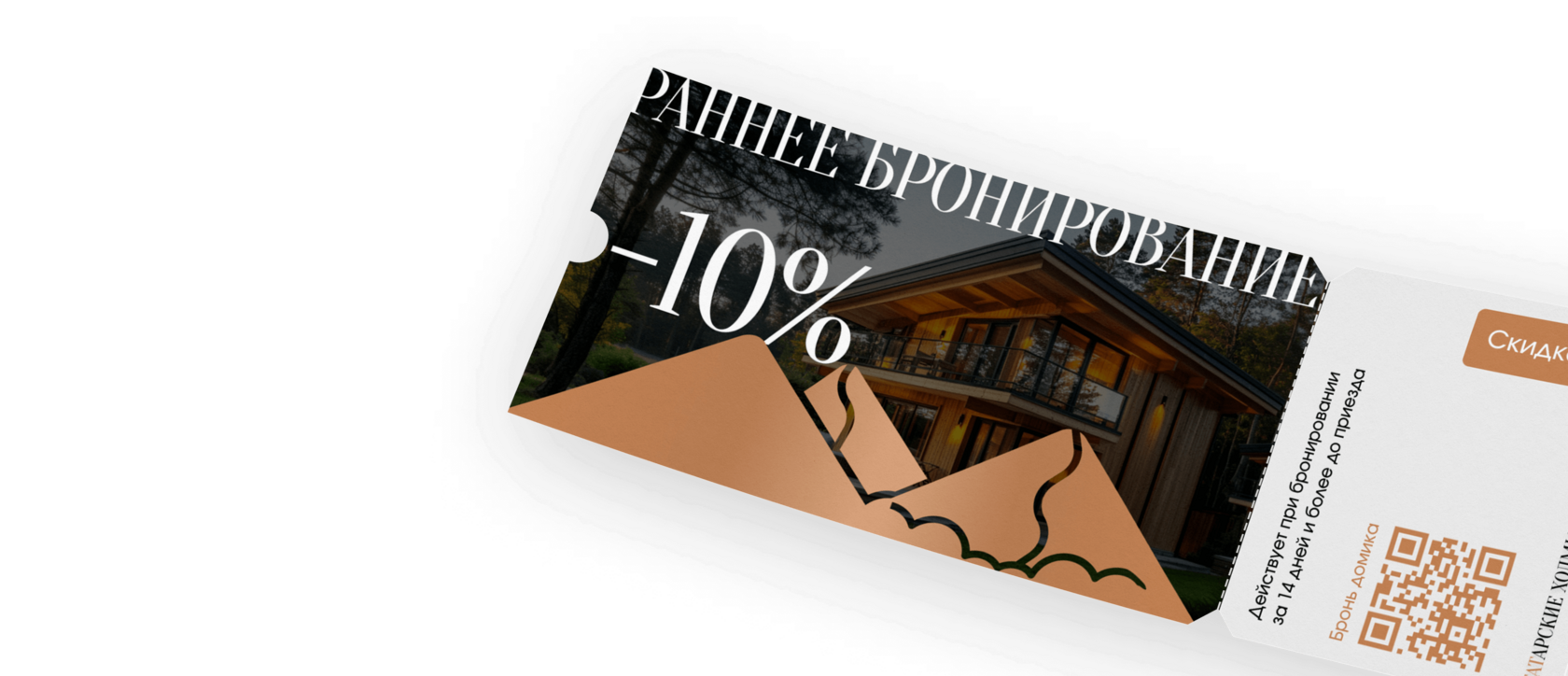 Специально для тех, кто планирует свой отдых заранее, мы рады представить наш выгодный тариф «Раннее бронирование», который дает 10% скидку на проживание в домиках.